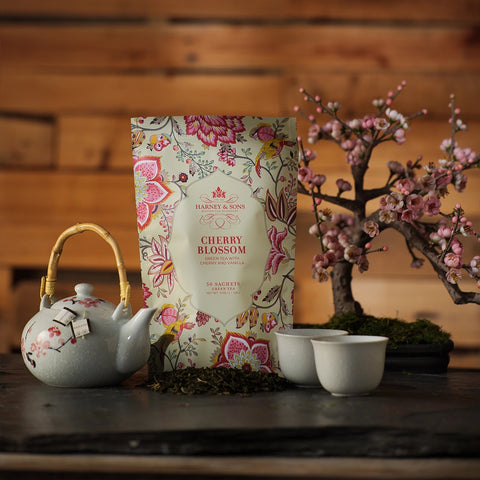A blend of green teas is flavored with ripe, fragrant cherries.