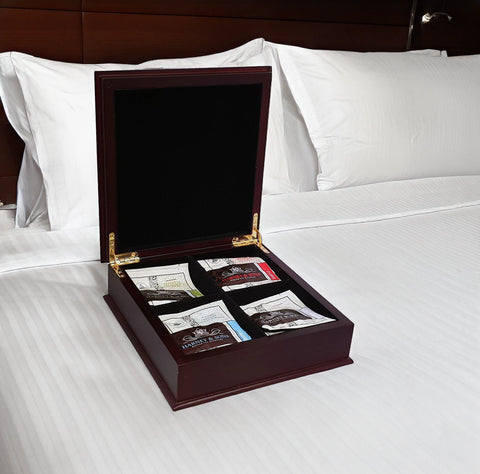 The wooden cassette is designed to present a wide range of tea pyramids from the Wrapped Sachets collection. Thanks to the individually wrapped pyramids, each guest can choose the tea according to their taste. The photos are for illustration purposes only, the cassette is not filled with tea.